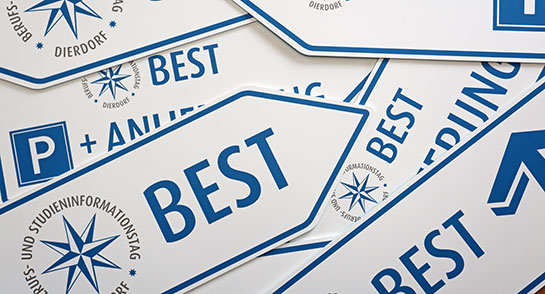Wegweiser und Logo für eine Berufsbildungsmesse