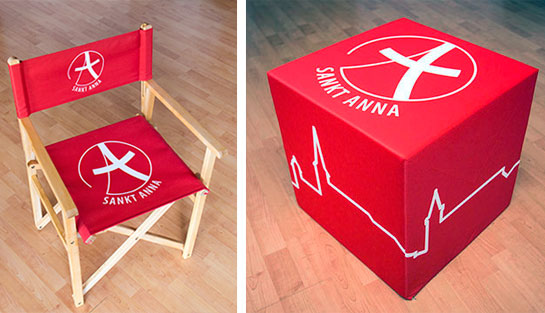 Sitzwürfel, Regiestühle bedrucktes Zelt und Beachflag, für eine Pfarrei.