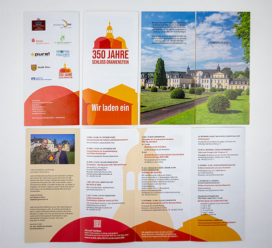 Logo, Veranstaltungsflyer und Anzeigen für das Jubiläum eines Barockschlosses