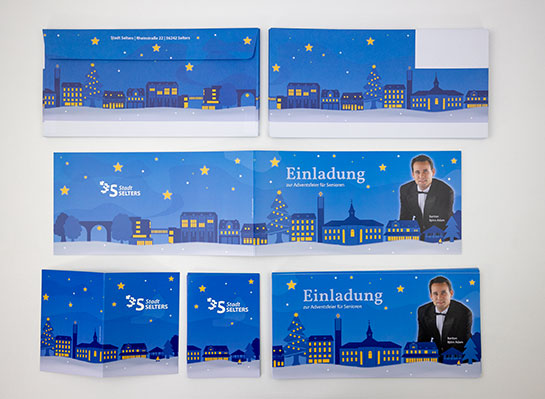 Weihnachtliches Motiv mit "Skyline" einer Kleinstadt als Keyvisual für eine Veranstaltung. Einladungen, Umschläge, Kärtchen, Bühnenbanner, Rollups